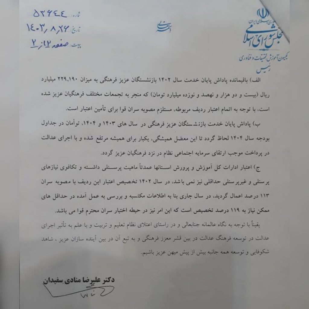 با هدف رفع این مشکل مزمن و به امید تحقق عدالت برای جامعه فرهنگی و آموزشی کشور، پیشنهادهایی اجرایی در کمیسیون آموزش، تحقیقات و فناوری مجلس شورای اسلامی ارائه کرده‌ایم و طی این نامه از جناب آقای قالیباف خواسته‌ام که این موارد را با جدیت در جلسه #سران_قوا مطرح کنند و مصوبات لازم را اتخاذ نمایند.