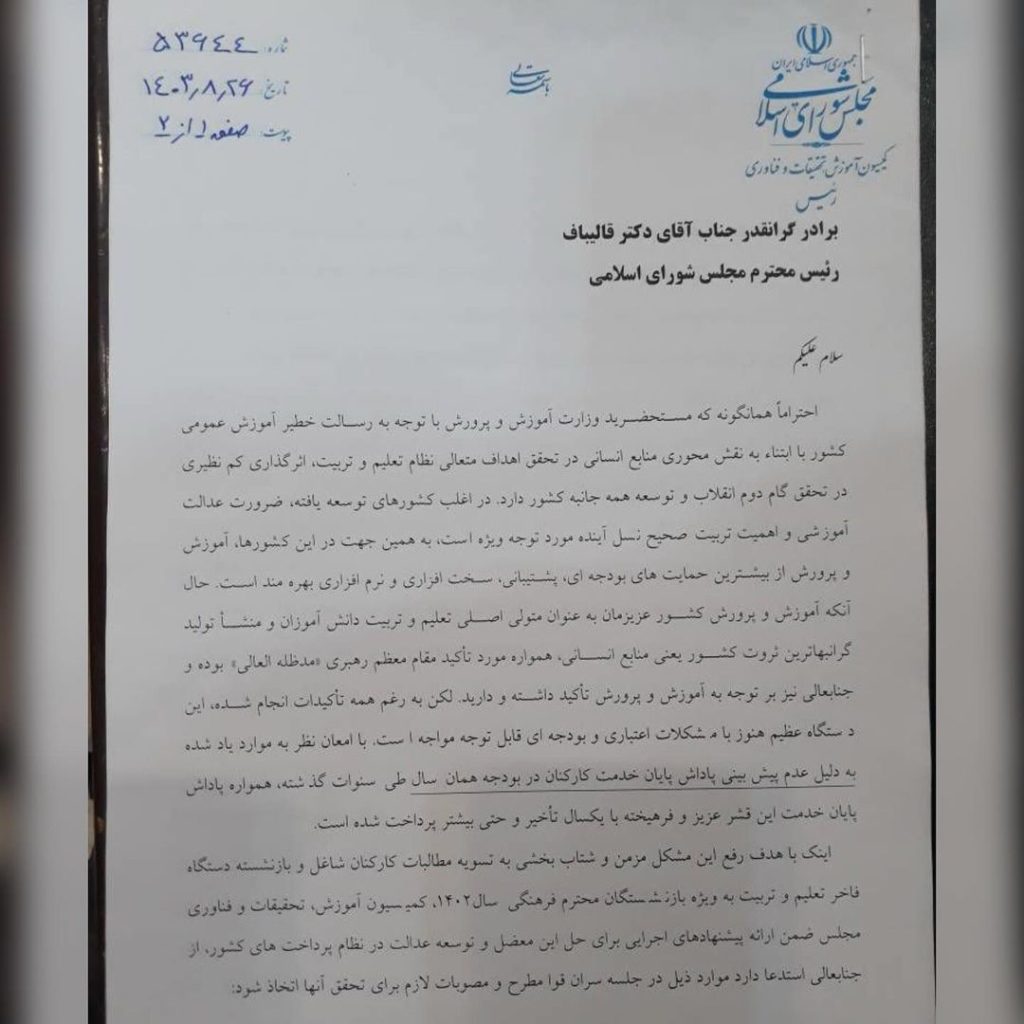 در نامه‌ای به برادر گرامی و محترم، جناب آقای دکتر محمدباقر قالیباف، رئیس محترم مجلس شورای اسلامی، به موضوعی بس حساس و حیاتی در عرصه تعلیم و تربیت کشور پرداخته‌ام. با اشاره به موانعی که همواره در پرداخت به‌موقع پاداش پایان خدمت کارکنان ارجمند و شریف دستگاه تعلیم و تربیت کشور وجود دارد، نکات قابل توجهی را به اطلاع ایشان رسانده‌ام.